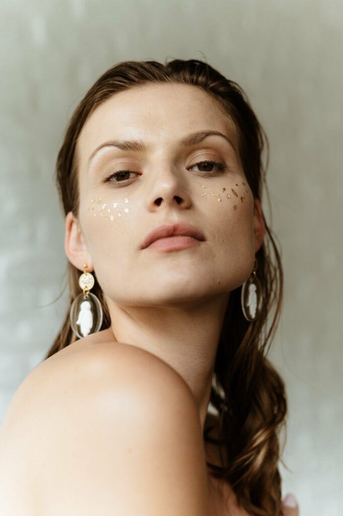 Le maquillage gold, soigneusement choisi, faisait écho aux détails dorés des bijoux, ajoutant une touche de sophistication subtile. Cette cohérence entre les bijoux, le décor, et le stylisme a permis de créer un moodboard visuel unique, résolument féminin et moderne.