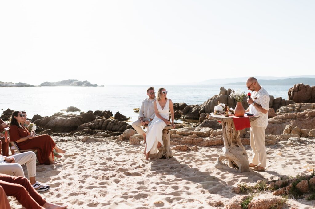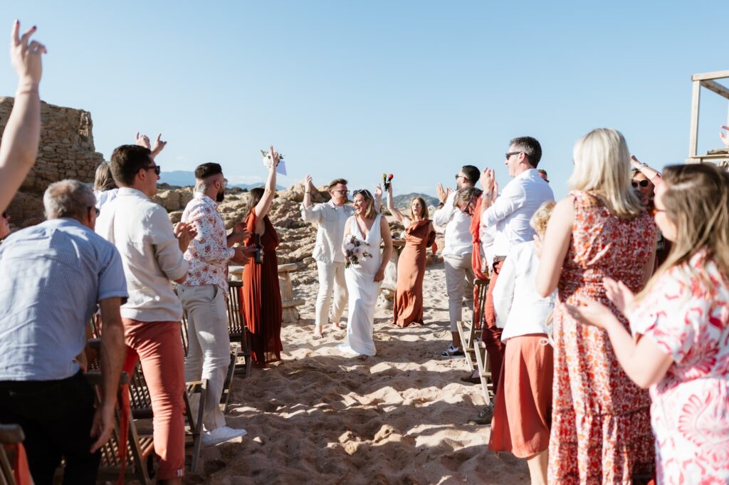 La cérémonie a eu lieu dans un cadre idyllique : pieds dans le sable, avec l’océan à perte de vue. Quelques chaises ont été installées pour les invités, une configuration intime et à taille humaine, loin des grands rassemblements impersonnels. Les mariés sont arrivés sur un zodiac, et Max a envisagé un instant de faire tomber Claire dans l’eau mais s’est ravisé. L’arrivée a été tout sauf ordinaire : les mariés ont débarqué en dansant, leurs pieds nus sur le sable, tandis que les invités vibraient de joie et de bonheur autour d’eux. Les témoins ont partagé des bières locales en faisant leur entrée, les Pietra, et les mariés ont trinqué avec eux, symbolisant ainsi leur union et l’amitié.